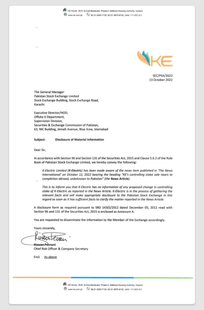 In a letter written to the General Manager of Pakistan Stock Exchange, K-Electric said that in accordance with section 96 and section 131 of the Securities Act, 2015 and clause 5.6.2 of the Rule Book of Pakistan Stock Exchange Limited, we hereby convey the following information: