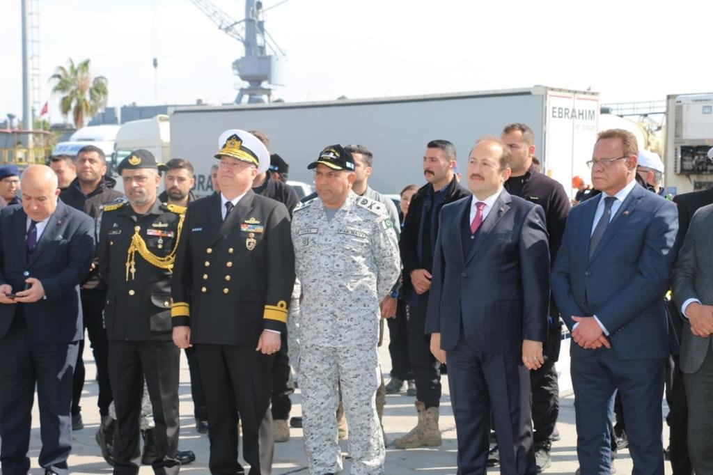 Governor Mersin Mr. Ali Hamza Pehlivan, Ambassador of Pakistan to Turkiye Dr. Yousaf Junaid, Deputy Governor Ibrahim Kuçuk, Mersin Emniyet Müdürü , Mehmet Aslan , Turkish dignitaries and representatives from media welcomed the Pak naval ship.