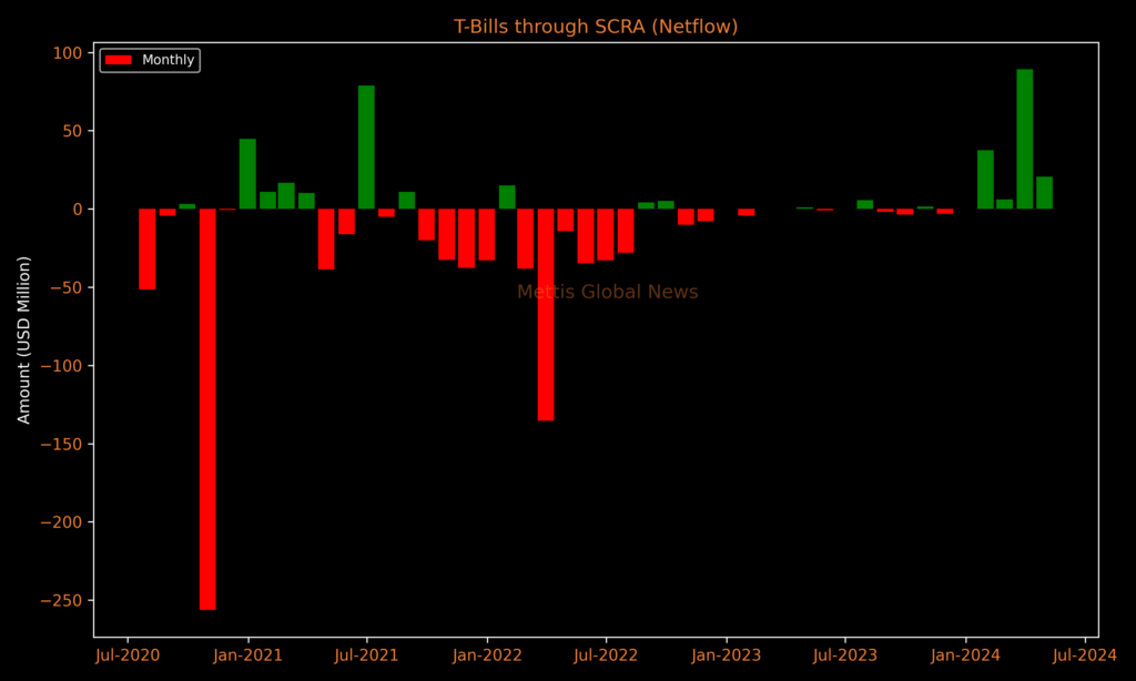 Throughout the current fiscal year, Pakistan has witnessed a substantial net flow of $152 million in T-Bills through SCRA, emphasizing the attractiveness of these investment avenues. The allure of T-Bills lies in their appealing returns, with rates reaching 21.66% for three-month T-bills, 21.39% for six months, and 20.90% for 12-month papers, all denominated in Pakistan rupees (PKR).