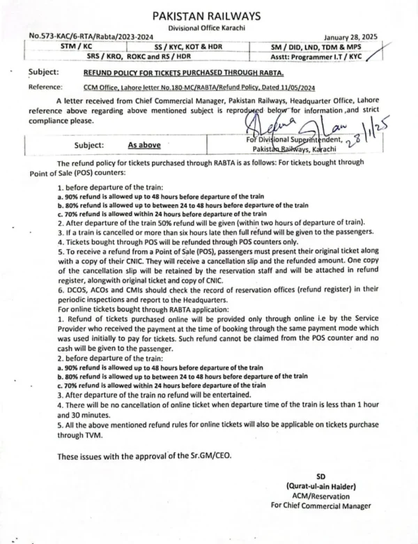 Pakistan Railways has announced a revised refund policy for tickets purchased through Point of Sale (POS) counters and online platforms such as RABTA.