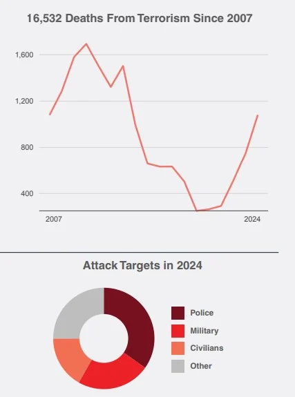 Balochistan and Khyber Pakhtunkhwa remain the most severely affected provinces in Pakistan, accounting for over 96% of all terrorist attacks and deaths in 2024. Their shared border with Afghanistan has made them particularly vulnerable to cross-border militancy and insurgent activities.