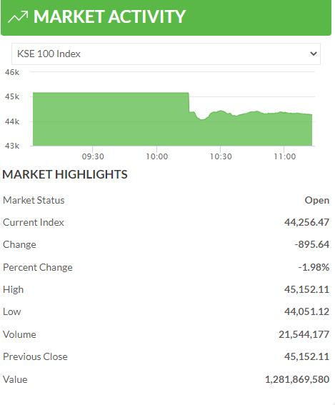 At present, Pakistan Stock Exchange is trading around 44,256 points with a decline of 895 points. On Friday the PSX edged up over 45,300 points when the opposition parties claimed its majority in the National Assembly, but dissolution of NA derailed the positive sentiment at the market.