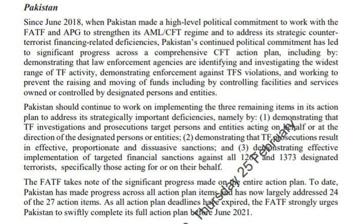 “The FATF takes note of the significant progress made on the entire action plan. To date, Pakistan has made progress across all action plan items and has now largely addressed 24 of the 27 action items.”