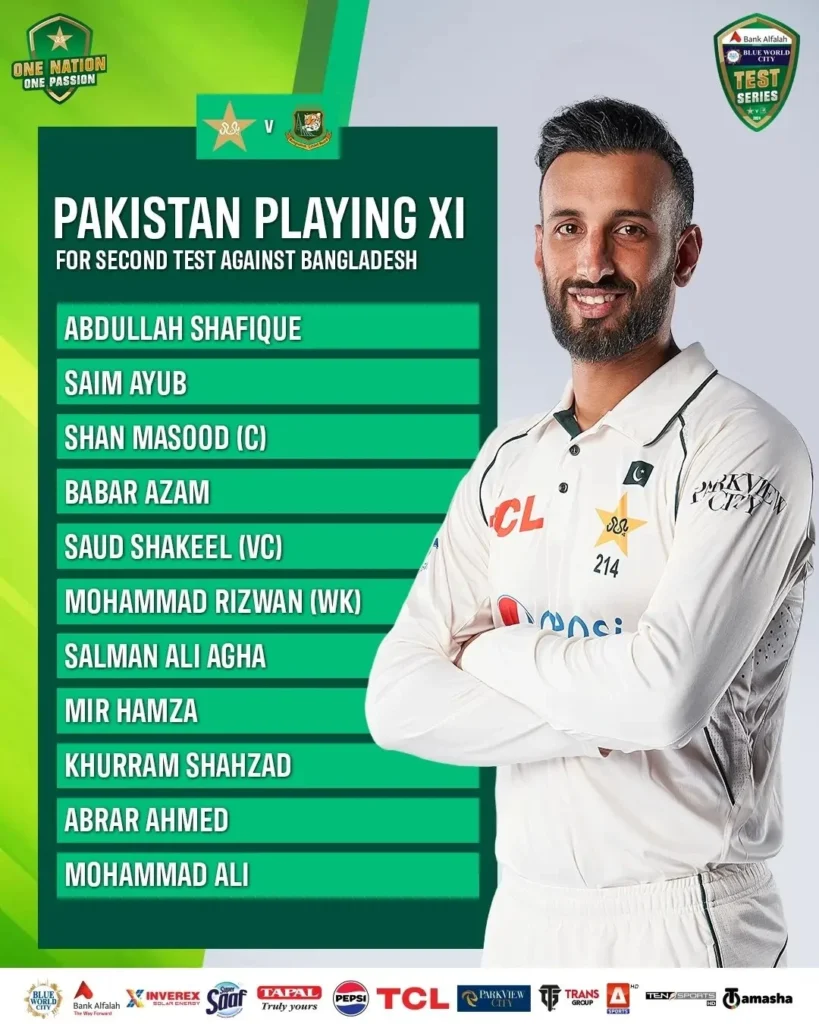 The current Pakistan squad for the second Test includes Captain Shan Masood, Saim Ayub, Abdullah Shafique, Babar Azam, Saud Shakeel, Muhammad Rizwan, Salman Ali Agha, Naseem Shah, Khurram Shahzad, Abrar Ahmed, Mir Hamza, and Muhammad Ali.