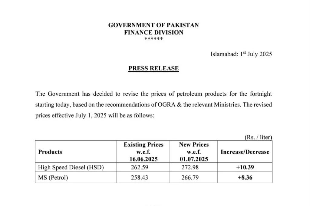 According to the Finance Division, the price of petrol has been raised by Rs8.36 per litre, bringing it to Rs266.79 from the previous Rs258.43. Meanwhile, the price of high-speed diesel (HSD) has surged by Rs10.39 per litre — now set at Rs272.98, up from Rs262.59.