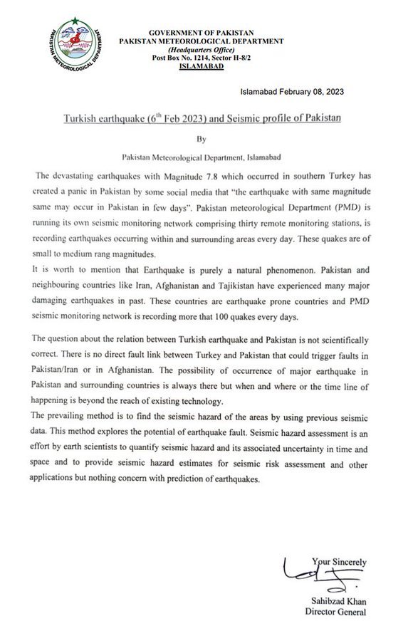 The devastating earthquake in Turkey created panic in Pakistan. News that “the earthquake with the same magnitude may occur in Pakistan in few days” was going viral on social media. PMD claimed that there is no scientific relationship between earthquakes in Pakistan and Turkey.