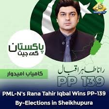 Sheikhupura: Rana Tahir Iqbal, the candidate from the Pakistan Muslim League-Nawaz (PML-N), won the by-election for Punjab Assembly constituency PP-139 on Thursday.