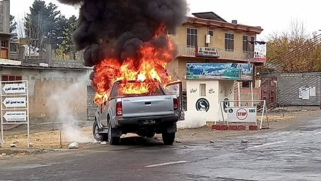 At least four vehicles, one of which belonged to an interim minister, and a building of Gilgit-Baltistan’s forest department were torched by unidentified persons on Monday. The protest arranged by the PPP against alleged rigging in a constituency in the recent GB elections turned violent, said poilce.