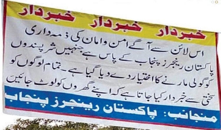 “Attention: Beyond this line, the responsibility for law and order lies with Pakistan Rangers (Punab), who have been given the authority to open fire at the miscreants so all people are strictly warned to return to their homes” reads the warning message .