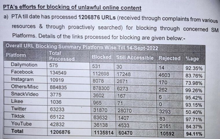 The telecom regulatory said that it processed around 1.2 million URLs for blocking which were then sent to the social media platforms concerned for further action. The PTA had received complaints about some of them while others were detected by the authority itself.