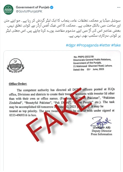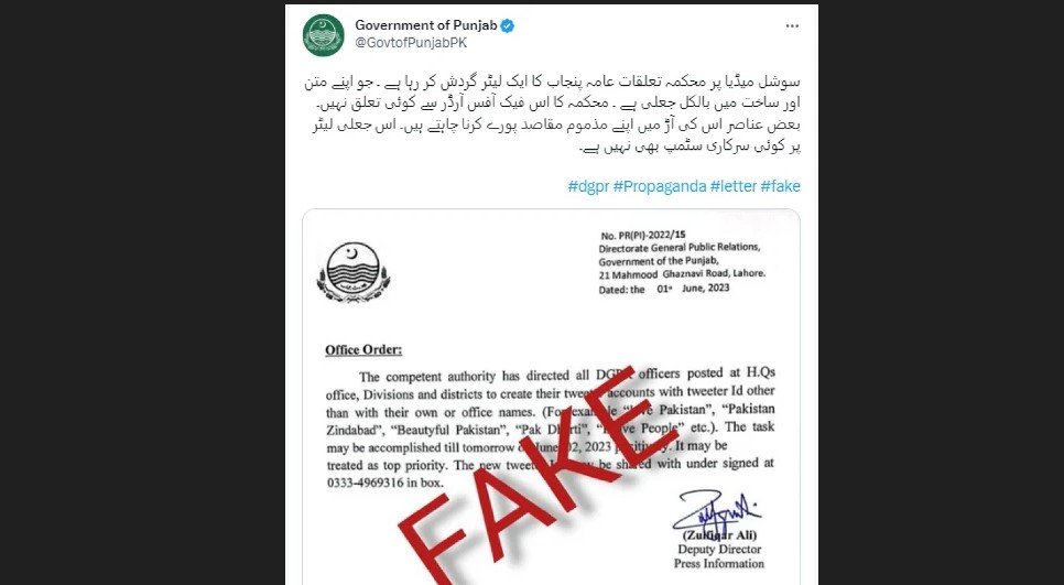 The Punjab Government Announced on Twitter: “A letter from the Public Relations Department of Punjab is circulating on social media, which is completely fake in its text and structure.”