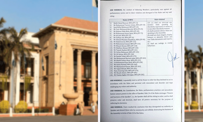 The suspended PTI members include Malik Fahad Masood, Muhammad Tanveer Aslam, Syed Rafat Mahmood, Yasir Mahmood Qureshi, Saima Kanwal, and others. They are barred from attending sessions or participating in Assembly committees for the duration of their suspension.