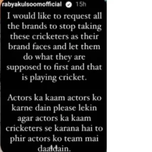 In her Instagram story, Rabya expressed her strong disapproval, stating, “Brands should stop making cricketers their ambassadors. Let them focus on the sport they were selected for—playing cricket! If cricketers want to act, let actors join the team!” Her statement highlighted the growing concern that national players seem more invested in promotional campaigns than in improving their on-field performance.