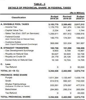 According to the Ministry of Finance the provinces will get PKR 2.87 trillion in the current fiscal year from their share in the federal revenues under the NFC Award and straight transfers. In 2019-20 provinces got PKR 2.4 trillion against the budget estimates of PKR 3.25 trillion. Punjab will receive PKR 1.43 trillion, Sindh PKR 742 billion, KP PKR 477 billion inclusive 1 percent for war on terror, and Balochistan will receive PKR 265 billion during current years.