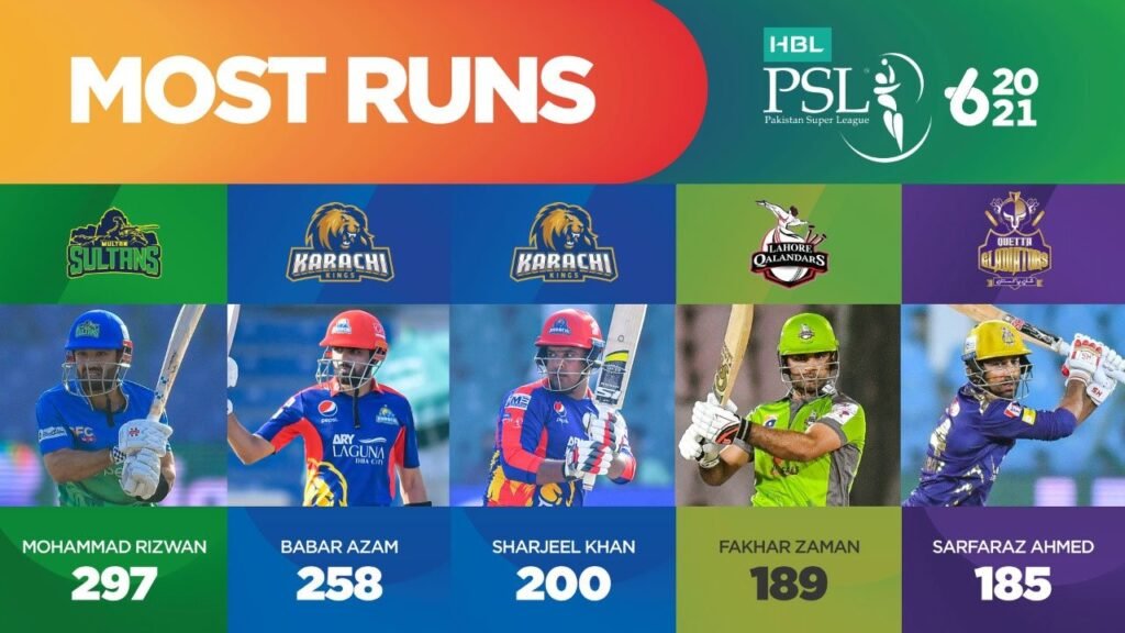 Rizwan hit three half-centuries in the Karachi-leg. Pakistan T20I captain and Kings batting mainstay Babar Azam scored 258 runs at 86. The right-hander maintained a strike-rate of 138.70 while registering three half-centuries for his side in their five games.