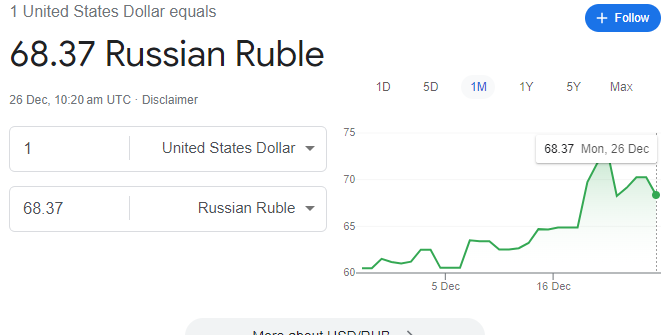 However, in the past few days, the value of dollar has fallen to 68 on Monday (Dec 26) from earlier 72 on Dec 22. It indicated that the Russian rubble or rouble has absorbed the shocks related to the US led western gas/oil price cap.