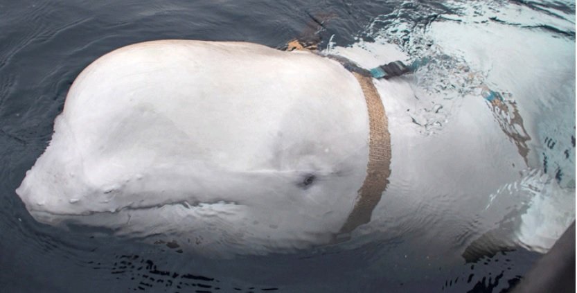 Hvaldimir first made headlines in 2019 when Norwegian marine biologists removed a man-made harness from him. The harness, equipped to hold an action camera, had “Equipment St. Petersburg” printed in English on its clasps.