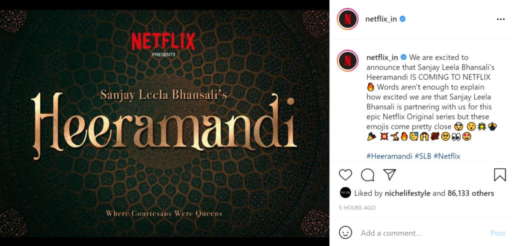 “Heeramandi is an important milestone in my journey as a filmmaker. This is an epic, first-of-its-kind series based on the courtesans of Lahore. It is an ambitious, grand, and all-encompassing series; therefore I am nervous yet excited about making it. I am looking forward to my partnership with Netflix and bringing Heeramandi to audiences all over the world,” Bhansali said in a press statement.