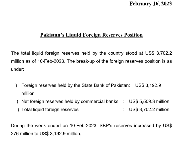 ISLAMABAD: The State Bank of Pakistan today reported an unexpected increase of $276 million in its reserves. The SBP’s reserves amounted to $3.19 billion by the weed ending 10th February 2023.