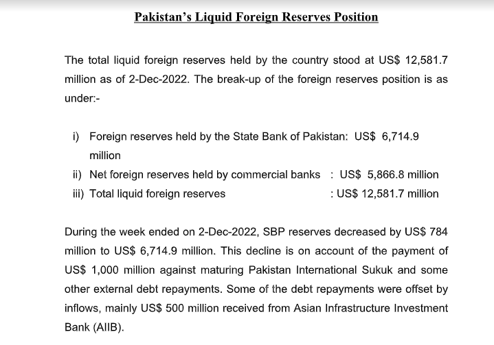 On Dec 2, 2022, the central bank has paid back $1 billion Sukuk bonds as a result of which the reserves have fallen to dangerous level even after receiving $500 million from the Asian Infrastructure Investment Bank.