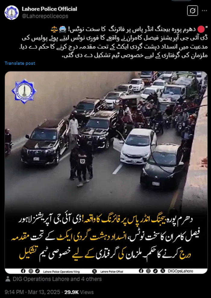Following the incident, Lahore police responded swiftly. DIG Operations Faisal Kamran took immediate notice and ordered the registration of a case against the suspects under the Anti-Terrorism Act. The authorities arrested four security guards and confiscated their weapons and vehicles.