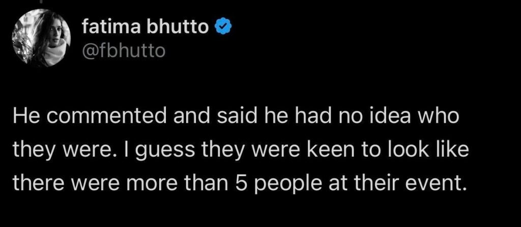 Author Fatima Bhutto called for Afridi to comment, and after his explanation, she noted, “He commented and said he had no idea who they were. I guess they [the FOI] were keen to look like there were more than five people at their event.”