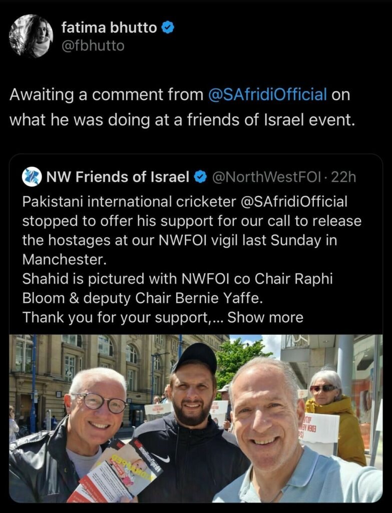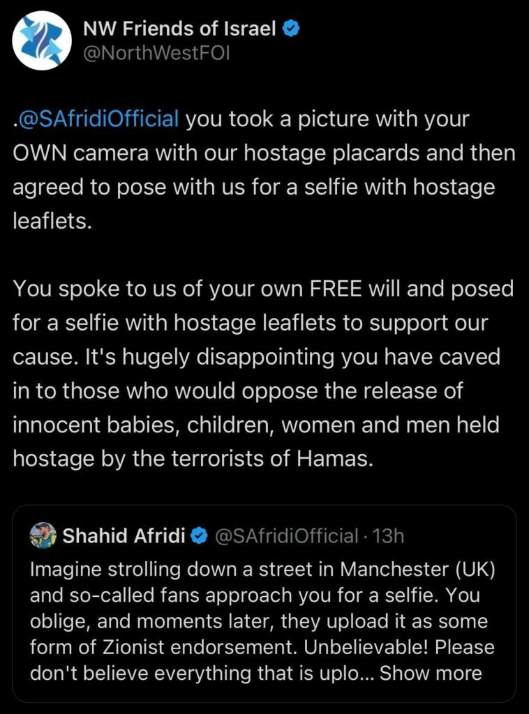 “Imagine walking down a street in Manchester (UK) and fans approach you for a selfie. You oblige, and later they upload it as some form of Zionist endorsement,” Afridi wrote on X (formerly Twitter). “Seeing innocent lives in Palestine suffer is truly heartbreaking. Any photo or association shared in Manchester does not reflect my support for any situation where human lives are at stake.”