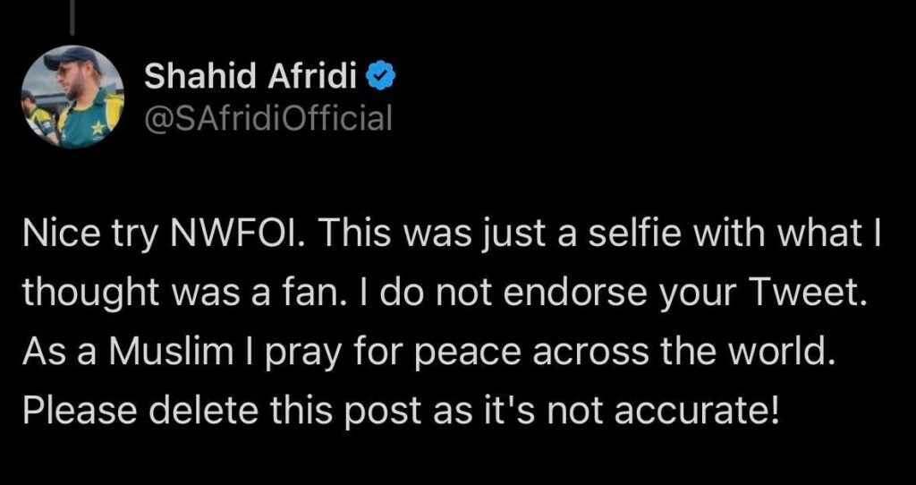 Afridi clarified that he believed the selfie was with a fan and did not endorse the FOI’s tweet. “As a Muslim, I pray for peace across the world,” he said, requesting the deletion of the inaccurate tweet.