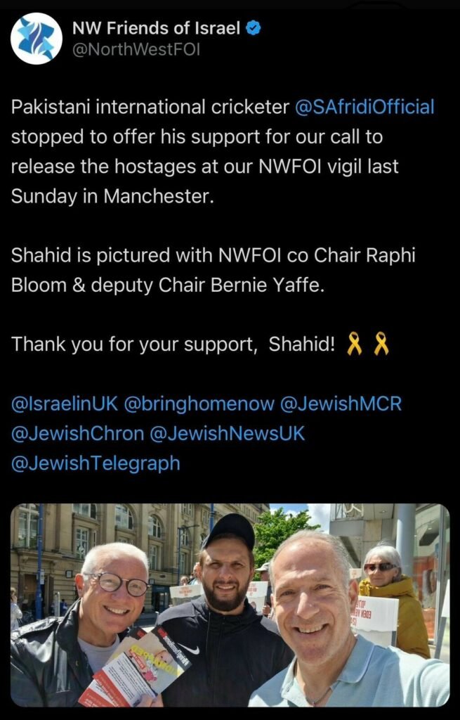 Shahid Afridi has denied endorsing the Zionist movement after Friends of Israel (FOI) posted a picture with the cricket star, claiming he supported their call to release hostages. The image, shared on Wednesday, shows Afridi in Manchester with two men, one holding a flyer about Israeli babies allegedly kidnapped by Hamas. The flyer prominently features the hashtag #BringThemHome, advocating for the hostages’ release taken by Hamas on October 7.