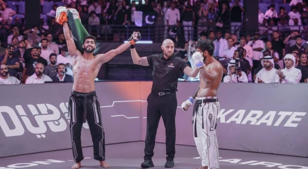 On April 21st, during the ‘Karate Combat’ event in Dubai, Shahzaib, a Pakistani karate fighter, swiftly knocked out his opponent, Singh, at the beginning of their match. He shared that he had dedicated considerable effort and trained in the United States to prepare for this particular encounter.
