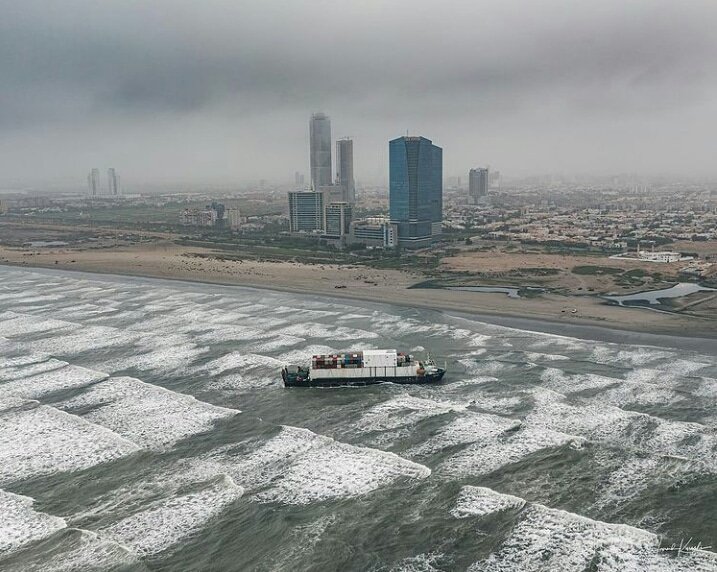 According to a Karachi Port Trust (KPT) spokesman, the ship came ashore due to high waves and a weak engine.