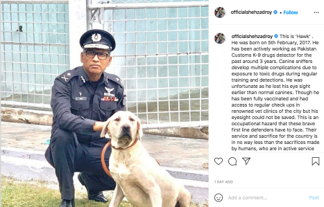 “Canine sniffers develop multiple complications due to exposure to toxic drugs during regular training and detection,” Roy continued. “[Hawk] was unfortunate as he lost his eyesight earlier than normal canines. Though he has been fully vaccinated and had access to regular check ups in renowned vet clinics of the city but his eyesight could not be saved.”