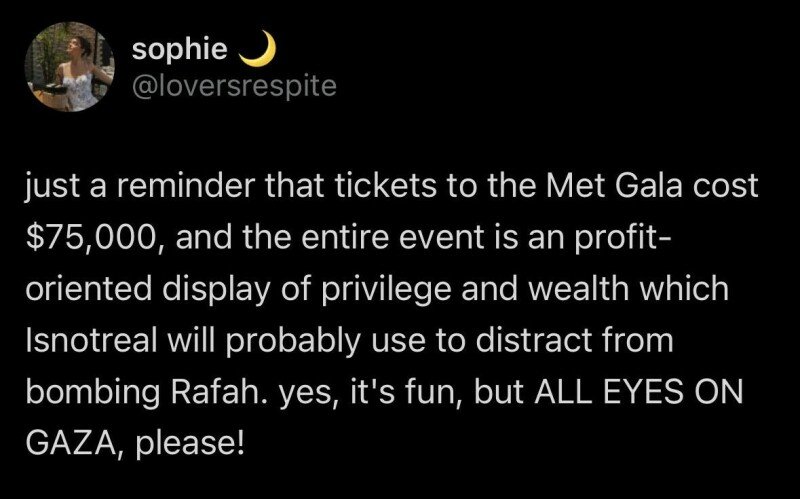 Criticism extended to the cost of Met Gala tickets, priced at $75,000 each, with some pointing out that the cost of one ticket could evacuate multiple families from Gaza.