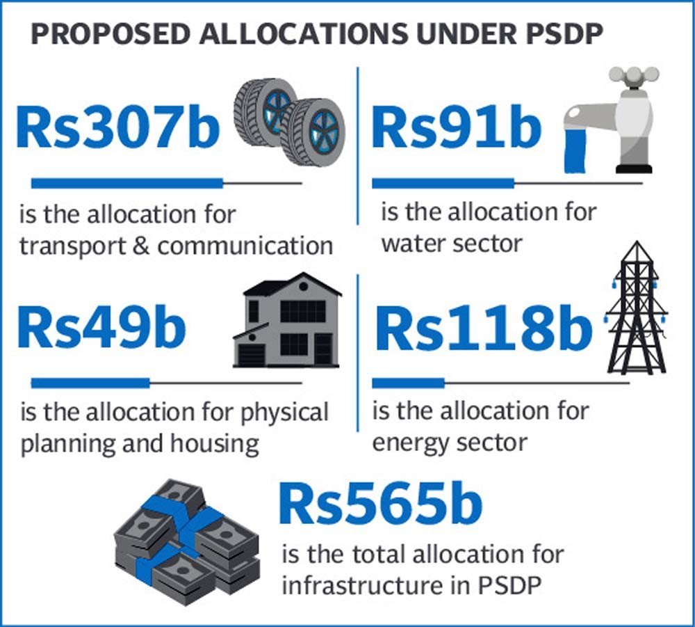 It has allocated 63% of total PSDP or Rs565 billion for infrastructure sector, according to the Ministry of Planning summary for the NEC. The health sector got only Rs30 billion or 3.3% and education sector Rs50 billion or 5.5% of the federal development budget.