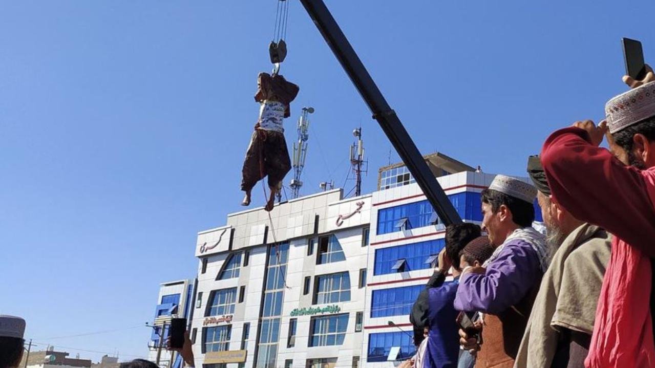 Graphic images posted to social media showed bloody bodies on the back of a pick-up truck while a crane hoisted one man up. Another video showed a man suspended from a crane at a major roundabout in Herat with a sign on his chest reading: “Abductors will be punished like this”.