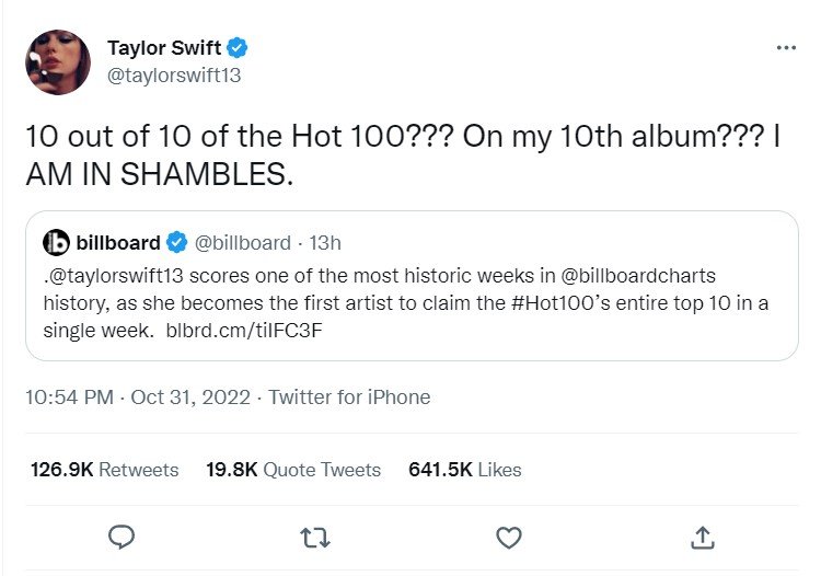 “10 out of 10 of the Hot 100??? On my 10th album??? I AM IN SHAMBLES,” the 32-year-old pop star tweeted.