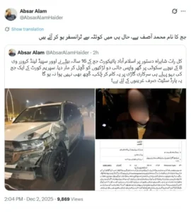 Journalist Saqib Bashir reported that attempts for an out-of-court settlement with the victims’ families had already begun. The accused is believed to be the son of Justice Muhammad Asif, who was recently transferred to Islamabad from Quetta. Following the incident, the judge reportedly went on medical leave, resulting in the cancellation of his bench’s cause lists.