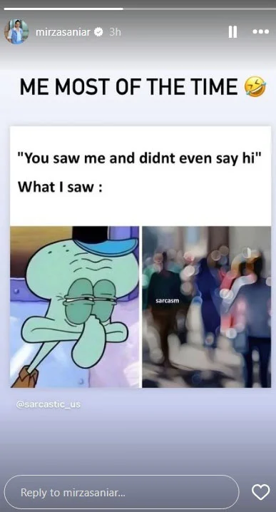 In her latest Instagram story, Sania Mirza posted a meme highlighting the relatable struggle of having blurred vision without glasses. Accompanying the image was a caption that humorously expressed her sentiment, saying, “ME MOST OF THE TIME.”