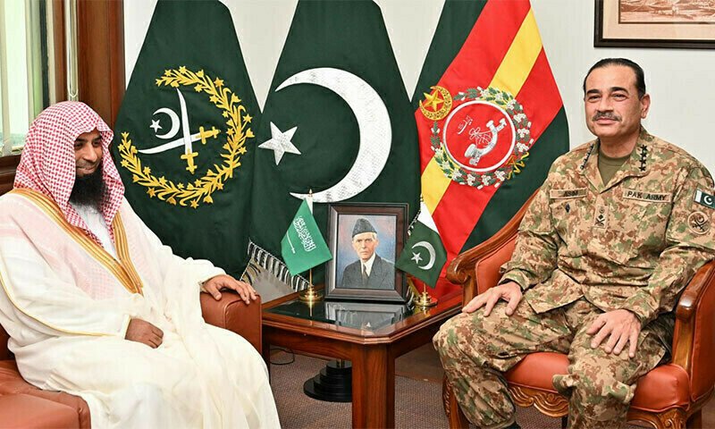 His Excellency Dr. Salah bin Mohammad Al-Budair, the Imam of Masjid-i-Nabvi (peace be upon him), visited Pakistani Chief of Army Staff (COAS) General Syed Asim Munir at the General Headquarters today. During the meeting, they discussed matters of mutual interest between Pakistan and the Muslim world.