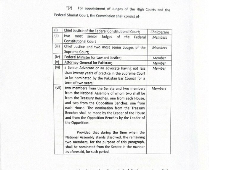 The amendment also outlines a commission responsible for appointing judges to the higher judiciary. When appointing judges to the High Courts and the Federal Shariat Court, this commission will be led by the Chief Justice of the federal constitutional court and will include two members from the constitutional court, along with the Chief Justice of the Supreme Court and two senior judges.