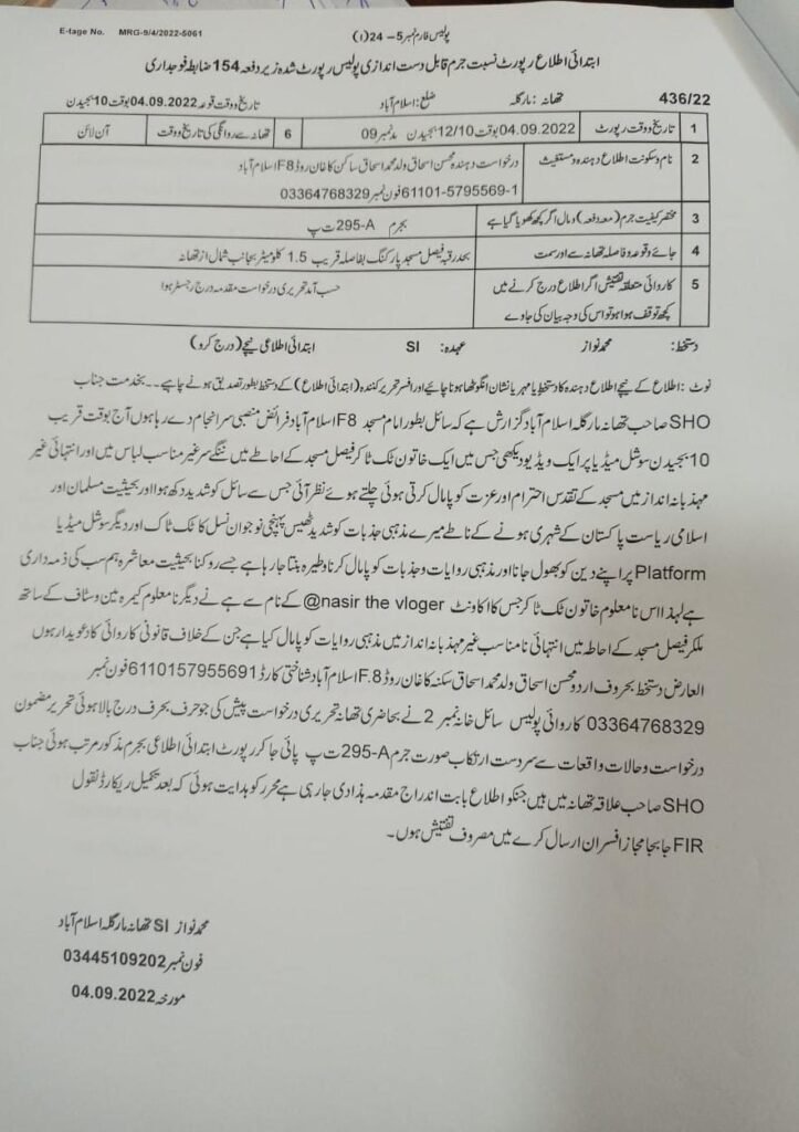 Based on Section 295 of the Pakistan Penal Code (PPC), which deals with “offenses linked to religion” and “injuring or defiling place of worship,” the first information report (FIR) was recorded at the Margalla police station.