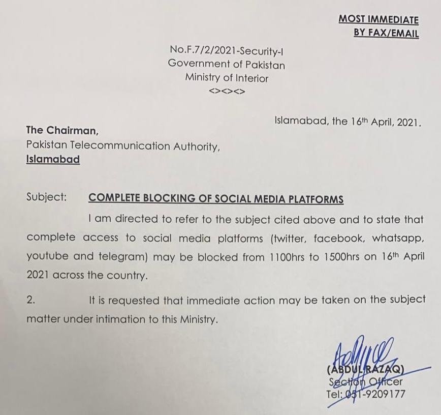 ISLAMABA: The Ministry of Interior on Friday directed the Pakistan Telecommunication Authority (PTA) to temporarily block access to social media platforms — Twitter, Facebook, WhatsApp, YouTube and Telegram — from 11am to 3pm.