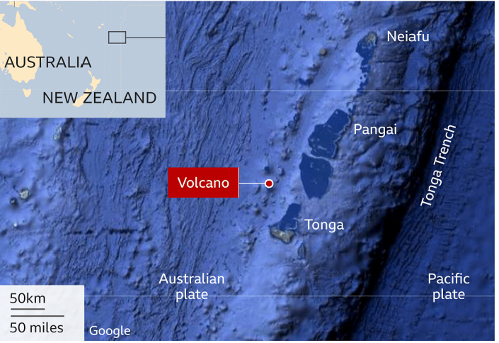 Located 2,000 miles (3,300km) east of Australia, Tonga is a collection of 170, mostly deserted, islands. The massive volcano that erupted underwater is of Hunga-Tonga-Hunga-Ha’apai, located 40 miles north of the capital of the Kingdom of Tonga.