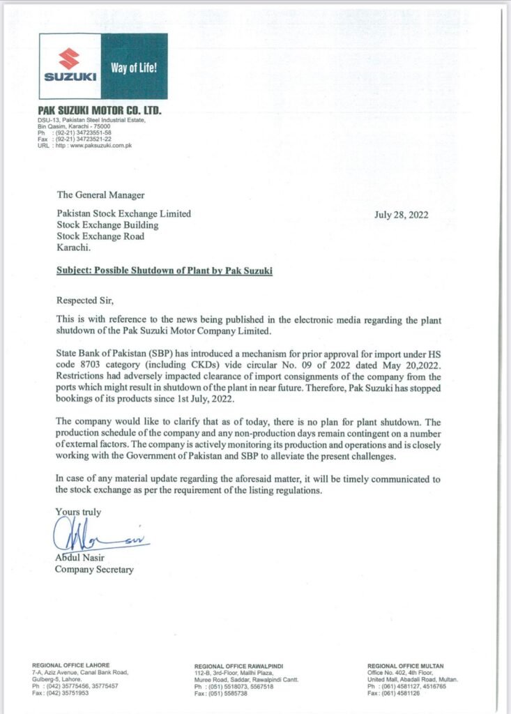 Suzuki Motors has clarified that there is no plan for plant shutdown. It said, “The production schedule of the company and any non-production days remain contingent on a number of external factors. The company is monitoring its production and operations and working with the government and SBP to alleviate the presence challenges.