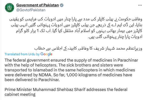 The federal government, in a December 27 statement on X, announced that a tonne of medicines had been airlifted to Parachinar by helicopter. Patients requiring urgent medical care were transported to Islamabad using the same helicopters.