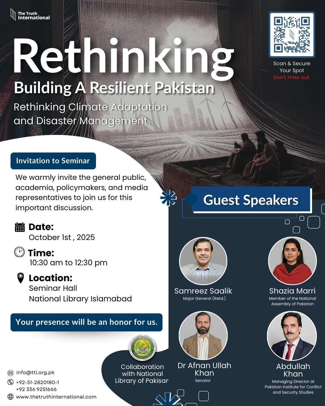 ISLAMABAD: The Truth International (TTI) is hosting an important seminar in Islamabad on Wednesday, October 1, 2025, at the Seminar Hall of the National Library in Islamabad.