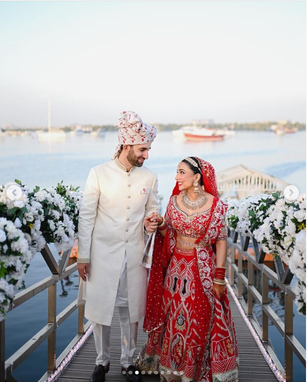 Ushna was dressed in a red lehenga designed by Pakistani brand Warda Saleem, which she wore while dancing with her husband and others at the wedding.