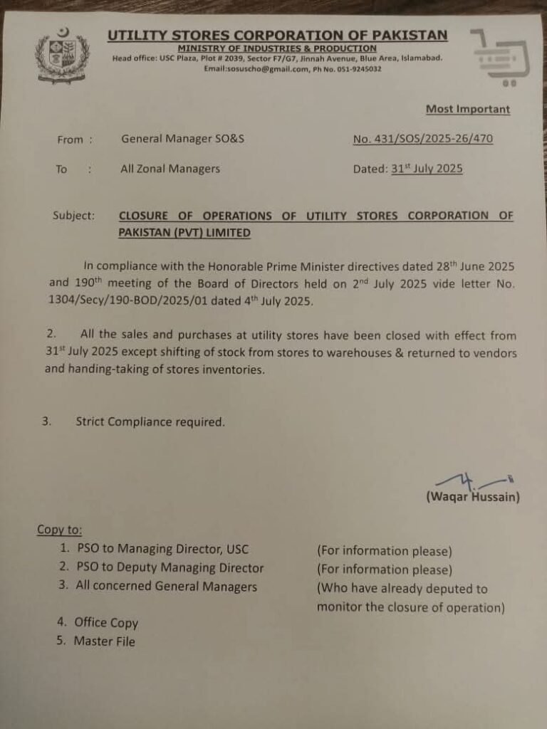 According to the notification, all sales and procurement activities at Utility Stores are to be discontinued starting today. This decision has been made under a directive from the federal government, marking a significant policy shift in the management of subsidized retail operations in the country.