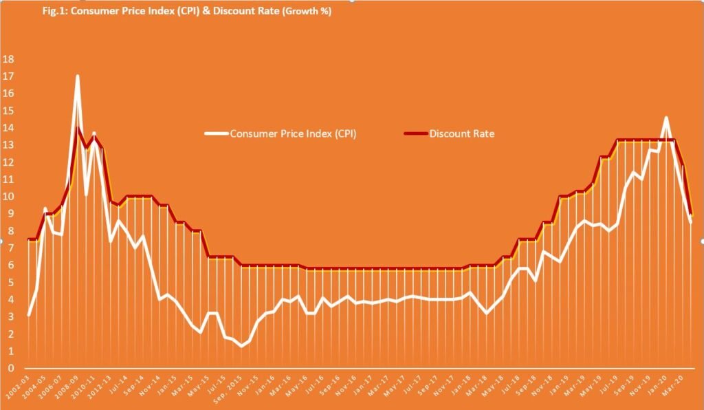 The Governor SBP had stated several times during the release of the monetary policy statement that inflation in Pakistan is a supply-side phenomenon followed by the rise of government-administered prices (prices of gas, electricity, etc.) and yet he continued to use the demand side instrument (discount rate) to contain inflation. He failed to see the composition of the CPI-basket where almost 35% of contribution comes from food items followed by the prices of gas, electricity, fuel, water, and house rent (24%). House rent is measured through the quarterly survey of the housing units for rent purposes. Transport charges are linked with fuel prices and it accounts for almost 6% weight to the CPI. Prices of medicines are largely controlled by the government (2.8%) Schools are not free to charge tuition fee (education) of their likings (3.8%). Thus, almost three-fourth of the CPI basket is not affected by the discount rate at all and yet our Central Bank continued to use this instrument to control inflation. This misconstrued policy alone added Rs. 1687 billion to interest payment from July 2018 till March 2020. It has simply eroded fiscal space, contributed immensely to widening fiscal deficit and rising public debt.