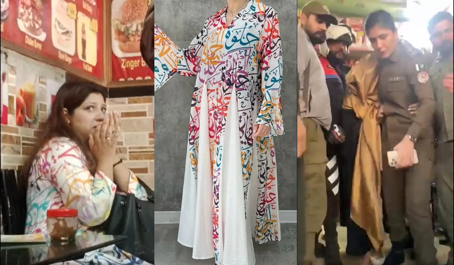 In the videos, the woman can be seen inside a restaurant wearing a dress adorned with vibrant Arabic calligraphy. The situation escalated to the point where multiple police officials, including members of the Dolphin Squad, intervened. Gulberg ASP Sheherbano Naqvi played a pivotal role, attempting to reason with the agitated crowd before escorting the woman out of the establishment. Notably, by the time she exited the shop, she was covered in a black burqa.